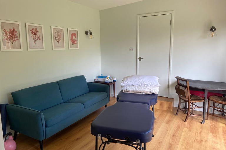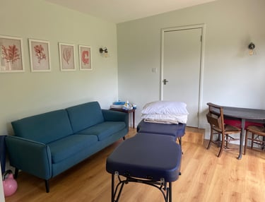 I work from a beautiful and tranquil studio, which looks out onto a wild flower meadow and lawn. It is a very calm and relaxing space, which I feel is important to help the therapeutic process. I often carry out exercise sessions on the deck and lawn.